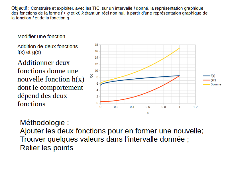 Une fonction représentant la somme de deux fonctions bénéficie des caractéristiques de chacune d’entre elles. Nous verrons plus en détail l’une d’entre elles : le polynôme du second degré.