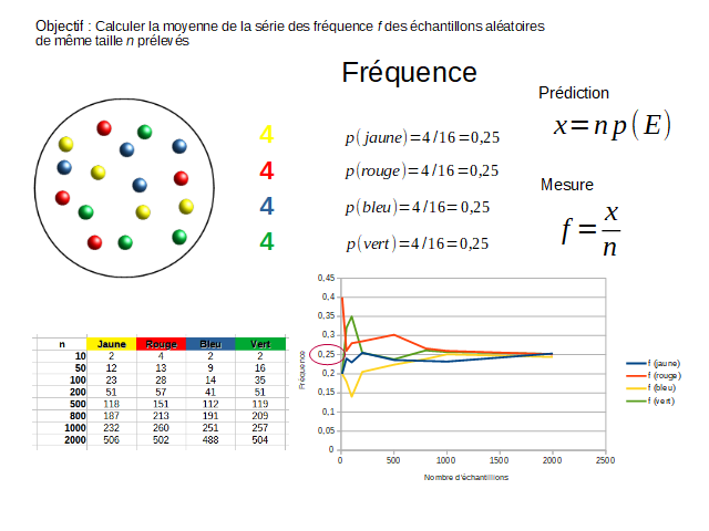 On peut comparer la fréquence de résolution d’une expérience avec sa probabilité. On note que la fréquence et la probabilité sont en accord quand la taille de l’échantillon devient suffisamment grande.