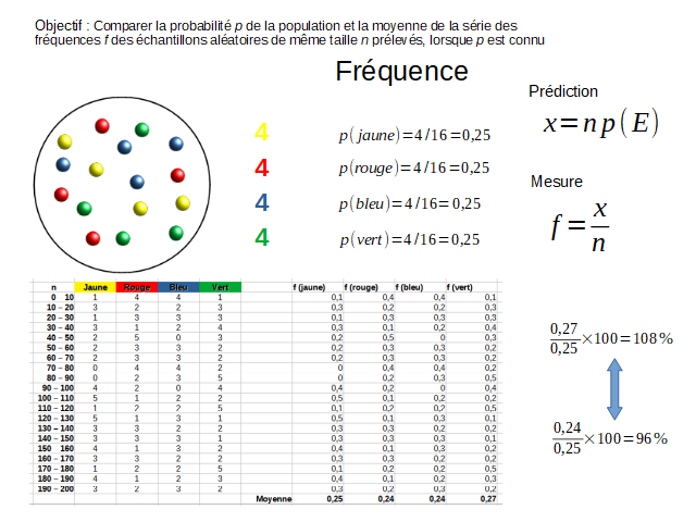 Si on prend de multiples échantillons, et calcule la moyenne des fréquences obtenues, on s’aperçoit que ces fréquences tombent en majorité entre deux valeurs. Comme vu précédemment, plus le nombre d’échantillons est important, plus la fréquence calculée est prêt de la probabilité prédite – plus la fourchette est petite.