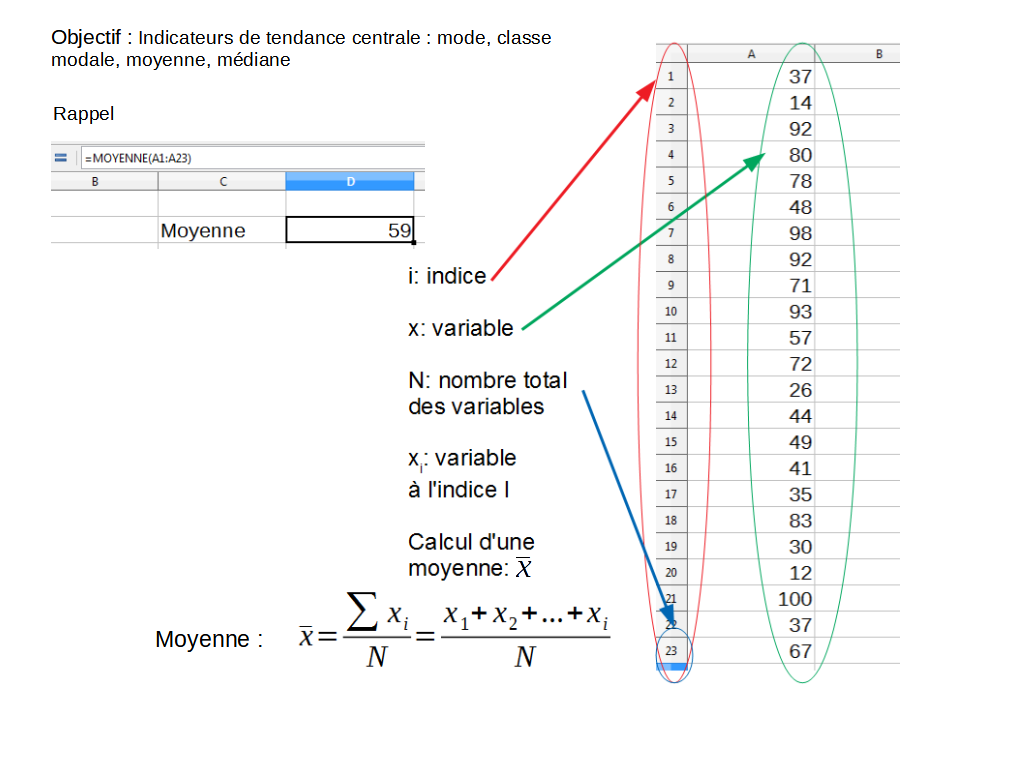 Pour rappel, on appelle moyenne la somme ∑ des variables divisée par le nombre de variables x. L’indice i d’une variable est un rang attribué à une variable.