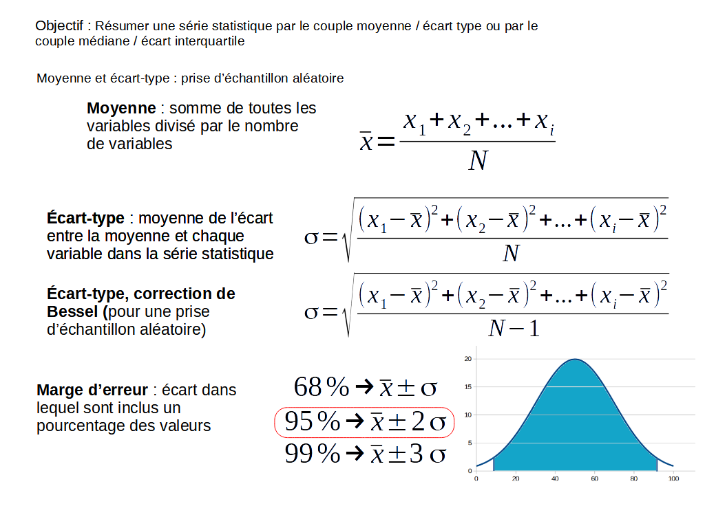 Avec l’écart type, on peut calculer la marge d’erreur en fonction de la confiance désirée. En règle générale, on utilise un intervalle de confiance englobant 95 % de la population, correspondant à la moyenne plus ou moins deux écarts-type.