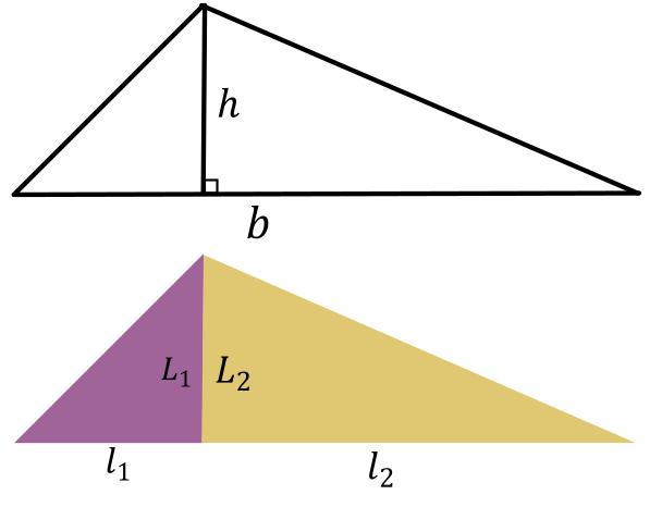 Un triangle a une base \(b\) et une hauteur \(h\). Il peut être décomposé en deux triangles rectangles (avec un angle droit), respectivement de largeur \(l_{1}\) et \(l_{2}\), et de longueur \(L_{1}\) et \(L_{2}\).