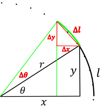 Toujours en utilisant Pythagore, on peut faire l’approximation, pour des petits changements de \(x\) et de \(y\), de l’arc de cercle \(l\) comme étant égal à \(\sqrt{\Delta x^{2} + \Delta y^{2}}\).