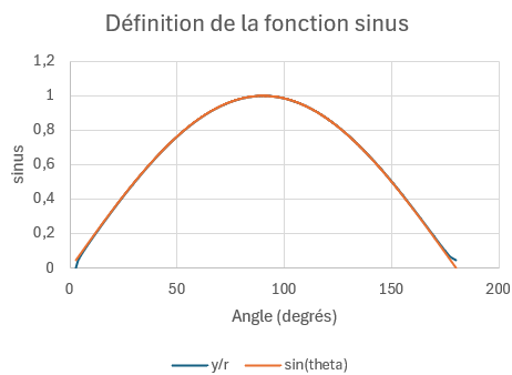 J’ai simulé ce que je viens de décrire sur une feuille de calculs ; calculé \(y\left( x \right)\), la valeur de \(\Delta l\) pour chaque écart \(\Delta x\ \); fait la somme des \(\Delta l\) pour chaque valeur de \(x\) et divisé par \(r\) pour obtenir l’angle ; et enfin calculé, pour chaque angle \(\theta\), le ratio de \(y\) sur l’hypoténuse \(r\). J’ai fait un graphique de la fonction de \(\theta\) ainsi trouvé, et comparé avec…