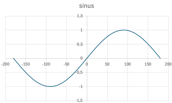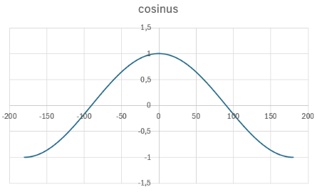 Enfin, toujours en comparant la représentation graphique des fonctions sinus et cosinus, on notera que la fonction cosinus est identique à la fonction sinus – juste décalée le long de l’axe horizontale, de 90° (\(\frac{\pi}{2}\)). On en déduit :