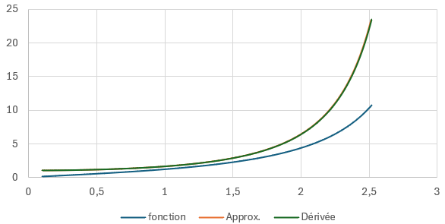 J’ai fait le test en comparant l’approximation avec ce résultat, et ça marche : si vous ne voyez pas la courbe rouge de l’approximation dans le graphique ci-contre, c’est qu’elle pile en dessous de la celle pour la dérivée…