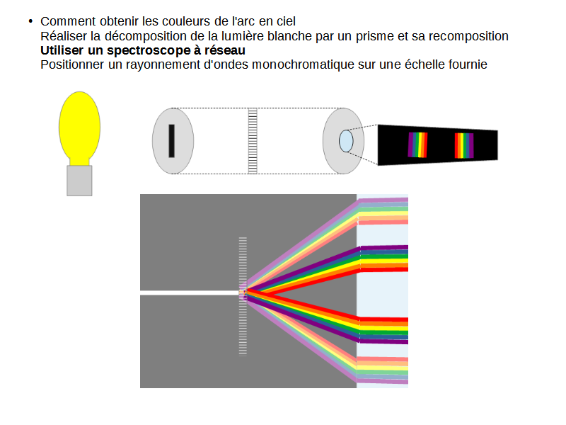 Une alternative au prisme est le réseau diffractant. Basé sur le phénomène de diffraction, ce morceau de plastique striée décompose la lumière. Une lumière blanche est provenant d'une source et passant par une fente étroite est ainsi divisée par le réseau diffractant en de multiples arc en ciels qui sont visible par la lentille : le spectre de cette lumière. L'utilité d'un spectroscope réside dans l'identification des composants d'une source lumineuse. On peut ainsi non seulement en apprendre plus sur une source lumineuse, mais aussi détecter des éléments ou des composés chimiques simplement par la lumière qu'il absorbent ou émettent.