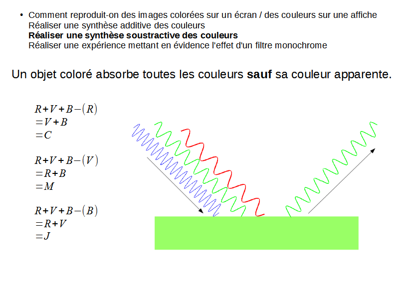 La synthèse soustractive des couleurs consiste à retirer une ou plusieurs couleurs pour obtenir la couleur émise par un objet. Certains objets n'absorbant qu'une couleur, leur couleur apparente consiste en la combinaison des deux couleurs de lumière émises. Ainsi, un objet cyan absorbe le rouge, un objet magenta absorbe le vert, et un objet jaune absorbe le bleu.