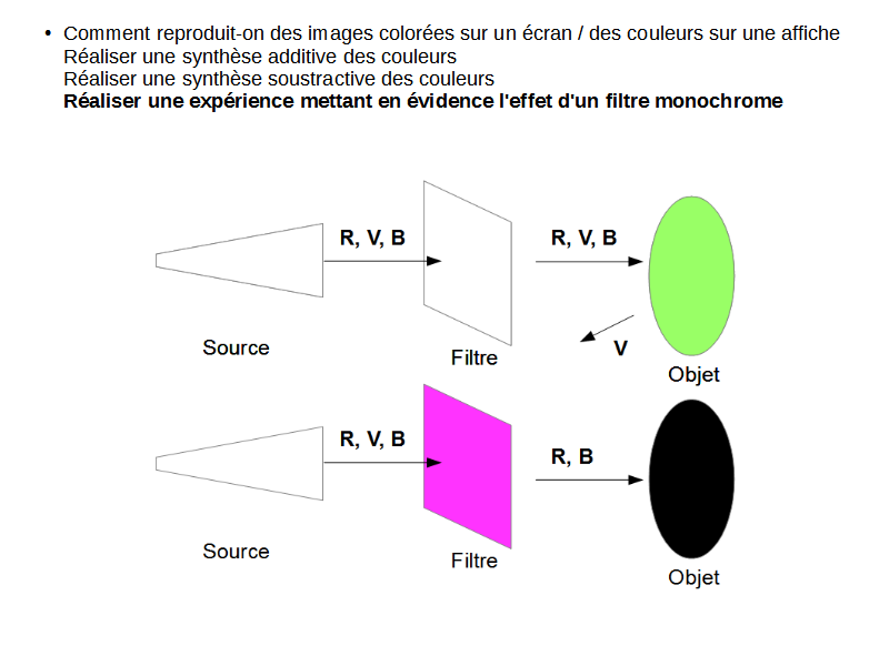 On peut manipuler la couleur d'un objet en changeant la couleur de la lumière qui l'éclaire. Ainsi, en utilisant un filtre coloré, on peut faire disparaître une couleur ou en faire apparaître une nouvelle.