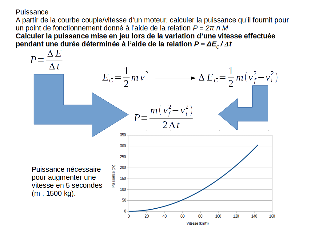 L’évaluation de la puissance moyenne consiste à mesurer le temps pris pour atteindre une certaine vitesse. A vitesse finale, le véhicule à une énergie cinétique définie. En divisant par le temps pris pour atteindre cette vitesse, on obtient la puissance moyenne du moteur du véhicule.