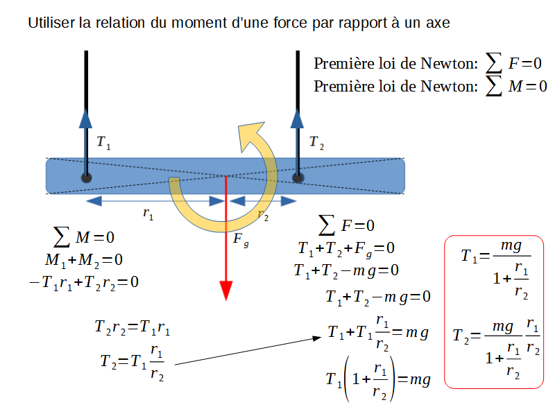 Dans cette exemple, on applique la somme des moments égaux à zéro (première loi de Newton) pour trouver la tension sur les deux cordes – utile si on doit décider quelle corde utiliser !