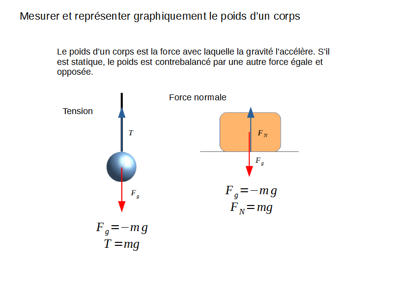 Le poids, représenté ici par Fg, est le produit de la masse par l’accélération due à la gravité. Comme toute force, son unité est le newton (N).