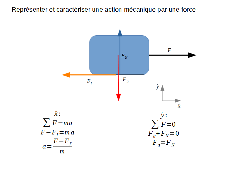 Supposons qu’on tire une masse avec une certaine force. Si la friction avec le sol existe mais est inférieure à la force, la masse accélère.