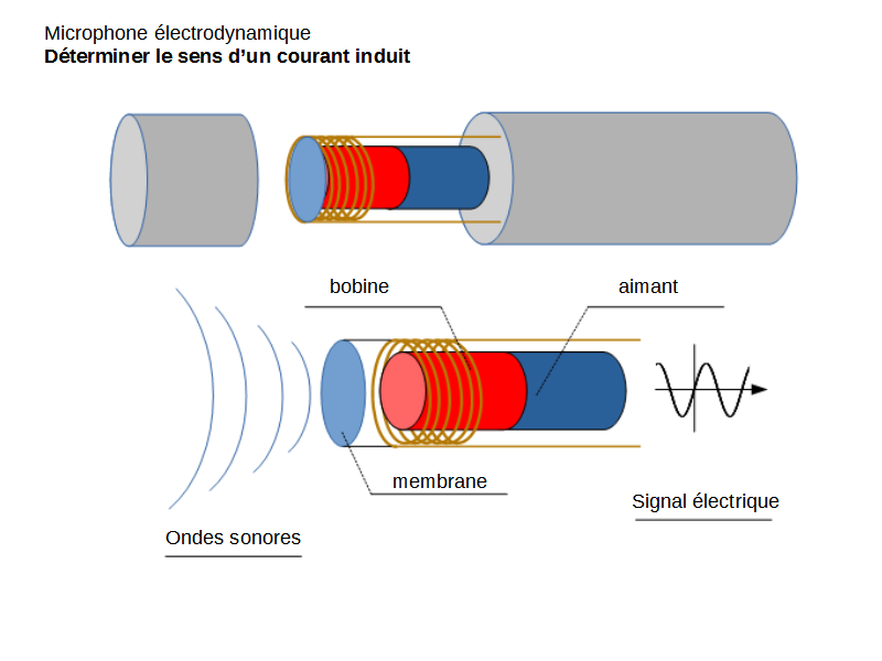 C’est ce principe d’induction de courant par le mouvement d’une bobine ou d’un aimant l’un par rapport à l’autre qui est à la base du fonctionnement d’un microphone électrodynamique :