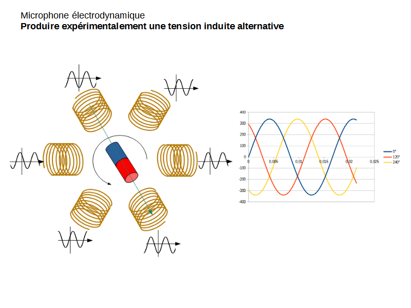 On peut appliquer le principe d’induction dans la génération d’électricité. Par exemple, en positionnant des paires de bobines autour d’un aimant rotatif (comme une dynamo ou une turbine), on crée plusieurs courants électriques. Le schéma ci-dessus décrit une organisation en étoile où chaque paire de bobine est espacée d’un angle de 120°. Cela donne trois courants (3 phases) espacées chacune de 120°.