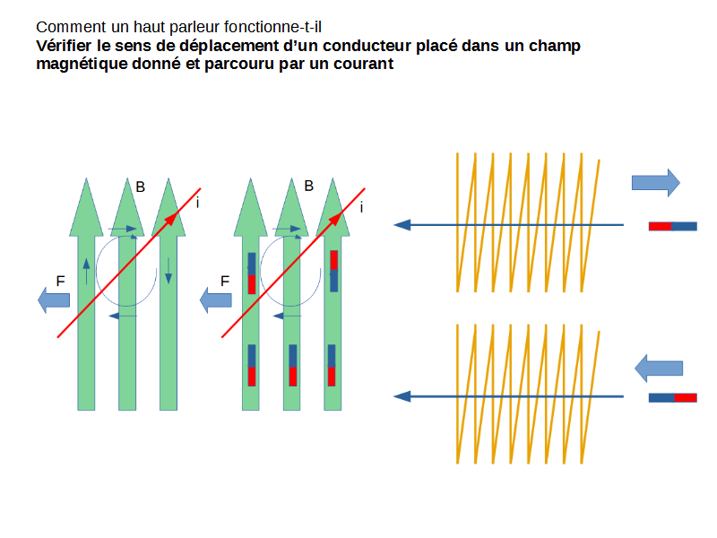 Pour une bobine proche d’un aimant, si son champ magnétique induit est dans la mème direction que celui de l’aimant, la bobine et l’aimant se repoussent. Si l’aimant est inversé, la bobine et l’aimant s’attirent.