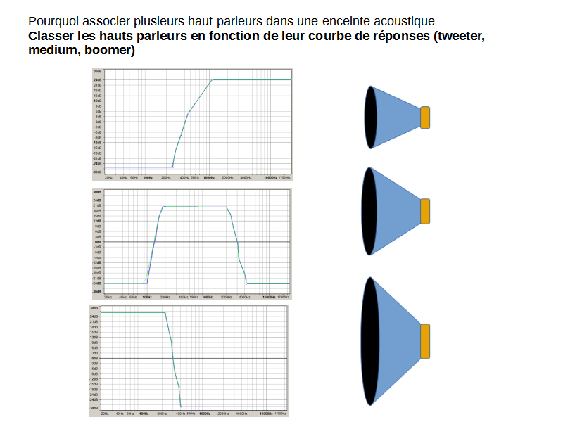 La bande passante de l’oreille humaine est de 20 Hz à 20 kHz. Pour reproduire cette bande passante il est souvent nécessaire de la diviser en plusieurs bandes passantes, plus petites, qui sont acheminés vers des haut parleurs de tailles différentes. Une petite membrane reproduit mieux les hautes fréquences (moins de surface à bouger pour un plus grand nombre de vibrations par secondes). Une grande membrane est plus à même de reproduire des fréquences basses (plus de surface pour un plus petit nombre de vibrations par secondes).