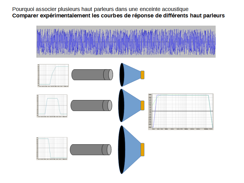 La bande passante d’un haut parleur est la variété de fréquences qu’il peut reproduire. En jouant un bruit blanc (white noise) incluant toutes les fréquences et en enregistrant le résultat en utilisant un micro à large bande passante, on peut diviser les haut parleurs en trois catégories :