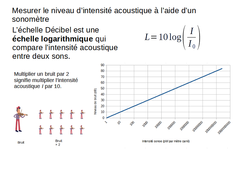 L’amplitude d’un son varie selon une échelle logarithmique. En effet, pour multiplier l’amplitude d’un son par deux, il ne suffit pas de multiplier les sources par deux.
