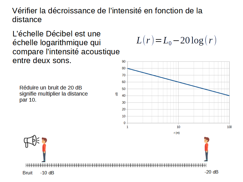 Le bruit est fonction de la distance entre la source et le récepteur. Cette fonction est elle aussi logarithmique. Cela signifie que pour diminuer un bruit de 20 dB, il faut multiplier la distance entre source et récepteur par dix.