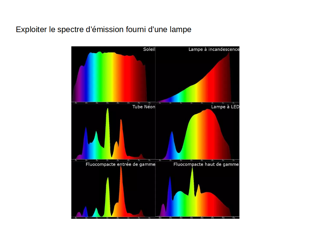 Différentes sources lumineuses utilisent différentes stratégies pour reconstituer une lumière blanche. Toutes sont basés sur la vision humaine, basée sur les cônes récepteurs dans notre rétine (RVB).