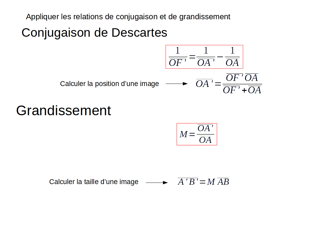 La conjugaison de Descartes relie la distance focale OF' à la distance entre la lentille et l'image OA' et la distance entre la lentille et l'objet OA.