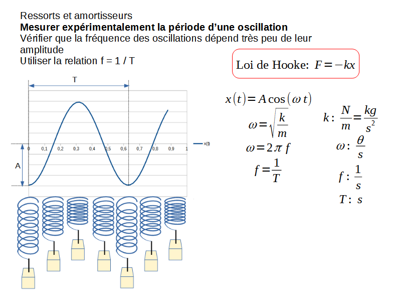On notera par ailleurs la valeur oméga (ω), qui bien qu’identique mathématiquement à la vitesse angulaire, est ici la racine carrée du ratio de la constante d’élasticité k sur la masse m.