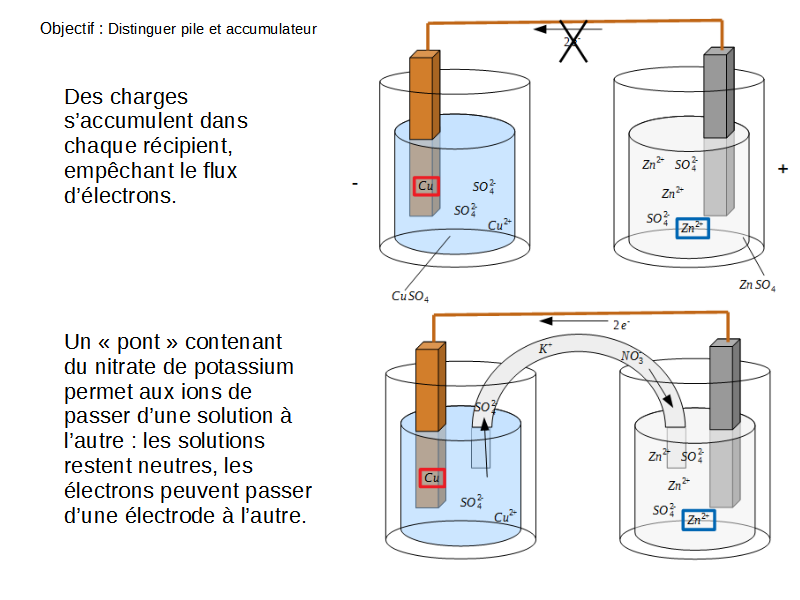 En connectant l’électrode en zinc à une électrode en cuivre baignant dans une solution de sulfate de cuivre, on peut faire passer les électrons dans un fil et donc obtenir un courant électrique. Le problème, c’est que dès que les électrons quittent le zinc, la solution de sulfate de zinc devient positive. S’ils pouvaient néanmoins arriver à l’électrode de cuivre, la solution de sulfate de cuivre deviendrait négative. Dans les deux cas, les électrons sont retenus et ne peuvent pas passer.