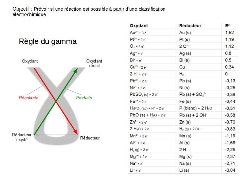 On peut alors utiliser ce tableau pour prédire des réactions d’oxydoréduction. La règle du gamma (voir illustration) donne les réactants (gauche de l’équation) et les produits (droite de l’équation).
