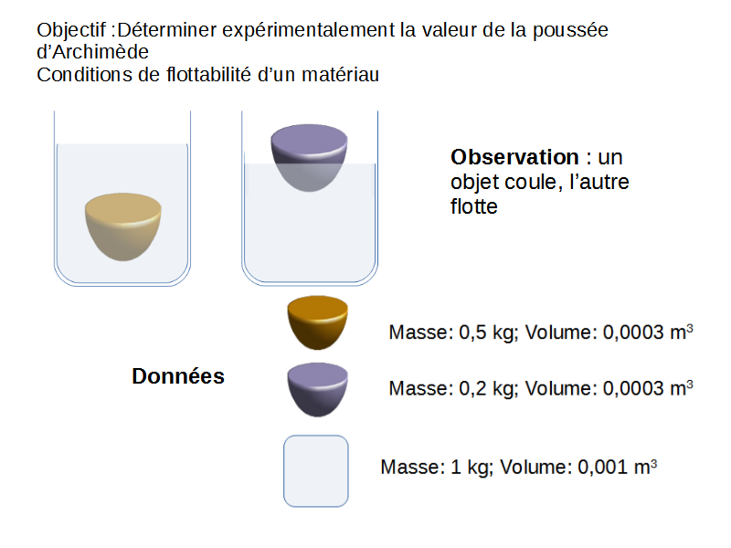 On observe qu’un objet coule quand on le met dans l’eau, alors qu’un autre flotte. En effectuant quelques mesures (le volume et la masse des objets et de l’eau), on devrait pouvoir découvrir une loi fondamentale.