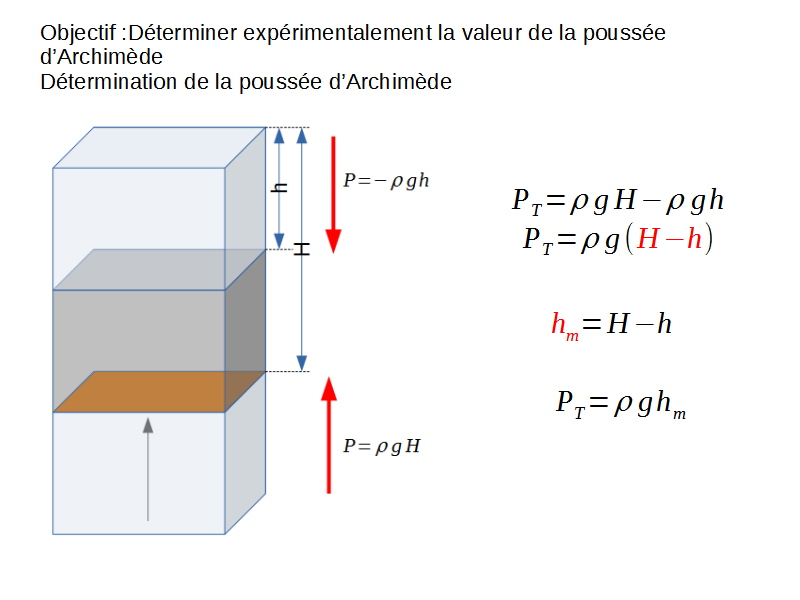 Donc, nous sommes ici dans une situation où deux pressions poussent sur une masse. Celle du bas est plus forte que celle du haut. On écrit alors une expression pour la pression totale : la somme des deux pressions agissant sur l’objet.