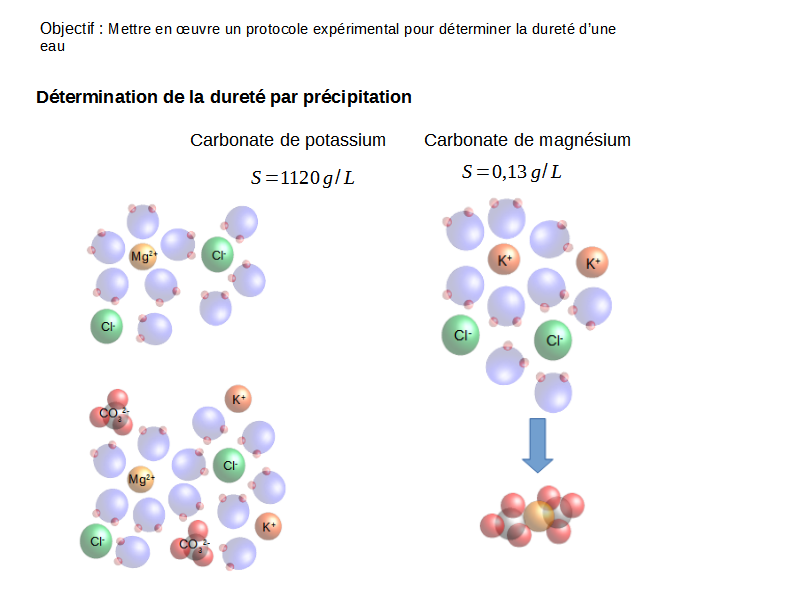Supposons qu’on a une eau dans laquelle du chlorure de magnésium est dissous. Pour connaître la concentration en ions de magnésium, on peut ajouter du carbonate de potassium, un composé qui a un une grande solubilité.