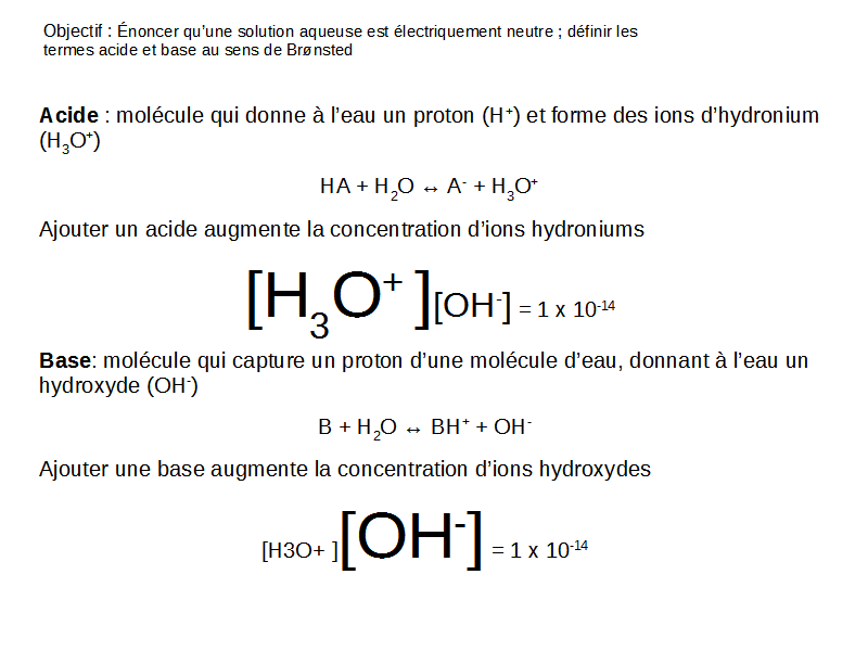 Ajouter un acide augmente la concentration d’ions hydroniums dans la solution. Ajouter une base augmente celle des ions hydroxydes. Cela ne veut pas dire toutefois que la solution acquiert une charge positive ou négative. En effet, les bases et acides conjuguées sont toujours présentes en solutions, rendant la charge neutre.