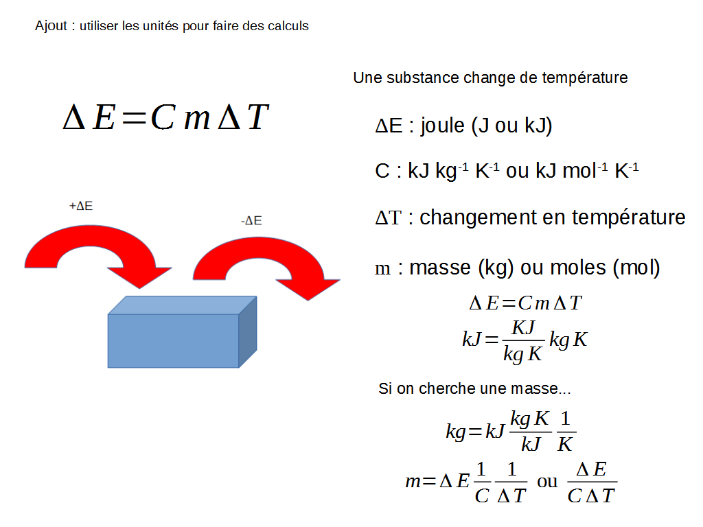 Ainsi, si on souhaite trouver des kilogrammes, on s’aperçoit qu’on en obtiendrait en divisant l’énergie par le produit de la capacité thermique massique et du changement en température.