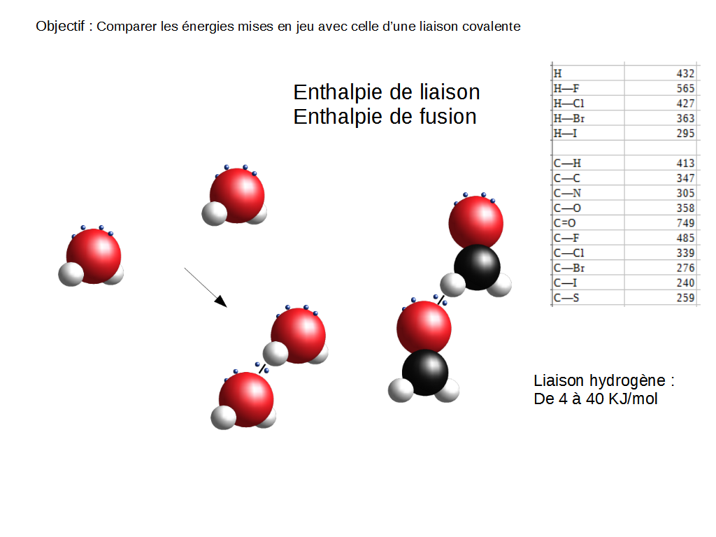 L’enthalpie de fusion de l’eau – où ces liaisons hydrogène se défont – est de l’ordre le la dizaine de kilojoules par moles. En comparaison, l’énergie requise pour séparer un mole de liaison C-H, comme dans un hydrocarbure, est de l’ordre de plusieurs centaines de kilojoules. La liaison hydrogène est donc bien plus faible que les liaisons covalentes, mais contribue toutefois à l’adhésion des molécules entre elles.