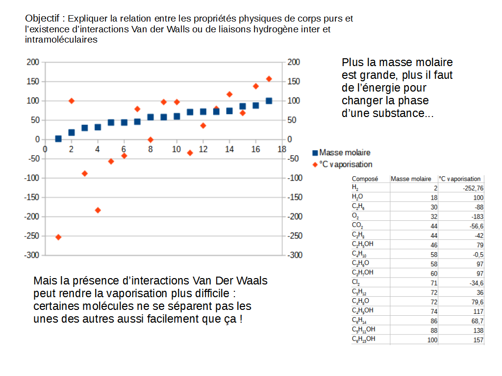La première manifestation d’interactions Van der Waals, incluant la liaison hydrogène, se voit dans l’évolution du point d’ébullition de plusieurs substance.