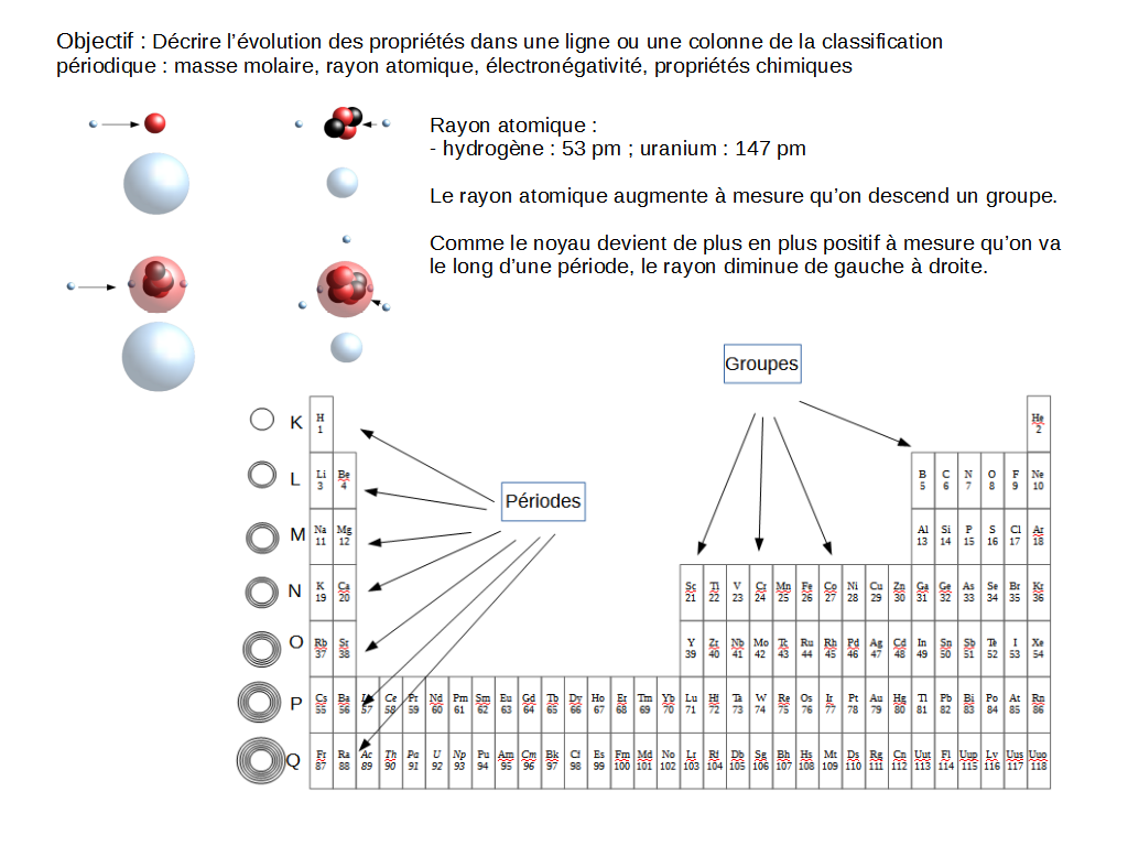 Le rayon atomique est la distance entre le noyau et l’électron le plus distant. Comme il y a plusieurs couches d’électrons, correspondant chacune aux période K, L, M, etc, un élément sur la première période est plus petit qu’un élément sur la seconde, et ainsi de suite.