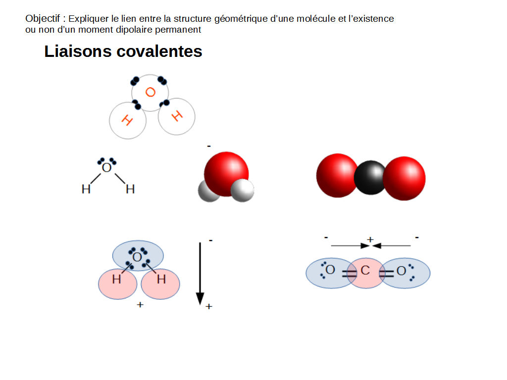 Les exemples ci-dessus présentent deux cas : l’eau et le dioxyde de carbone. On voit qu’une molécule d’eau a une concentration d’électrons sur l’oxygène, et aucun sur les atomes d’hydrogène. L’eau est donc dipolaire.