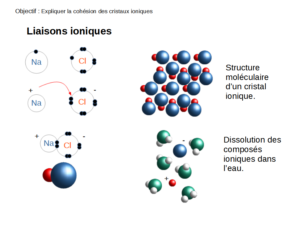 A l’état solide, une structure ionique s’organise en fonction de cette polarité. Le côté négatif d’un composé est attiré par le côté positif de son voisin, et ainsi de suite. Cette structure est appelé cristalline, même si les cristaux, dans le langage courant, réfèrent aux verres et autres diamants. En chimie, un cristal est une structure organisée.