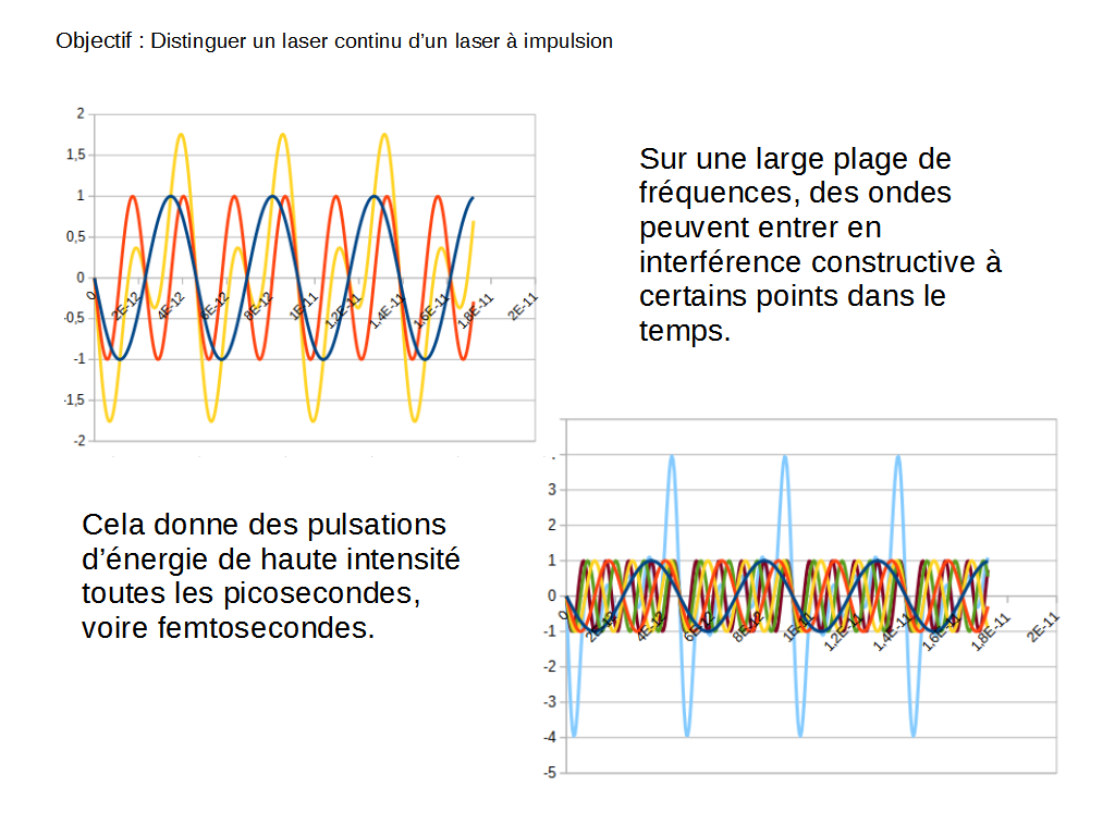 Un laser pulsé produit des multiples d’une longueur d’onde qui, en interférant entre elles, peut produire des pulsations de grande énergie.