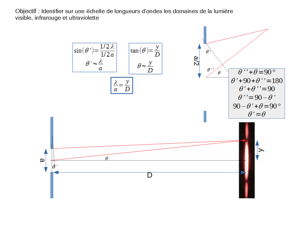On voit ensuite que ces angles sont équivalents aux quotients des distances : longueur d’onde sur taille de l’ouverture d’une part, et position du minimum et distance entre l’ouverture et l’écran d’autre part.