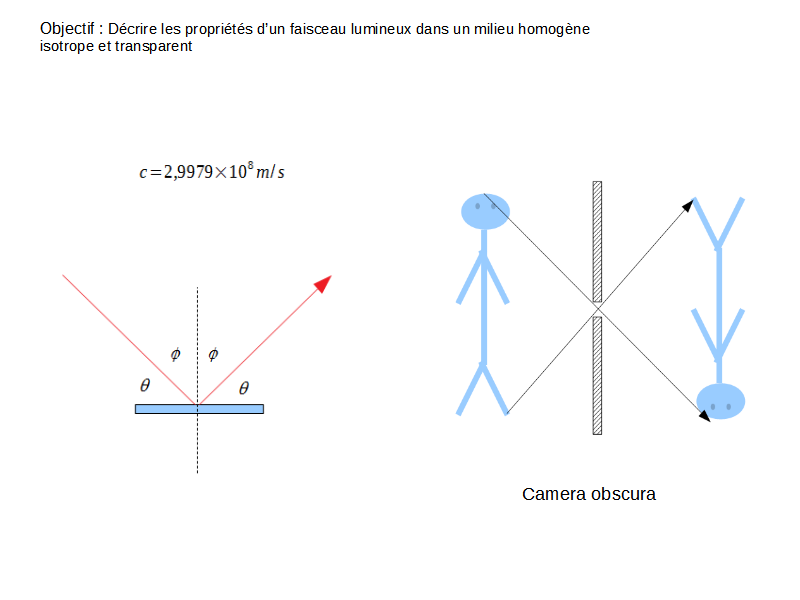 La lumière se déplace d’une source à un observateur de manière rectiligne dans un milieu homogène (identique en tous points) et isotrope (identique dans toutes les directions). On peut donc représenter la lumière comme une demie-droite qui part de la source, et interrompre cette droite lorsqu’elle arrive à un observateur ou sur un écran.