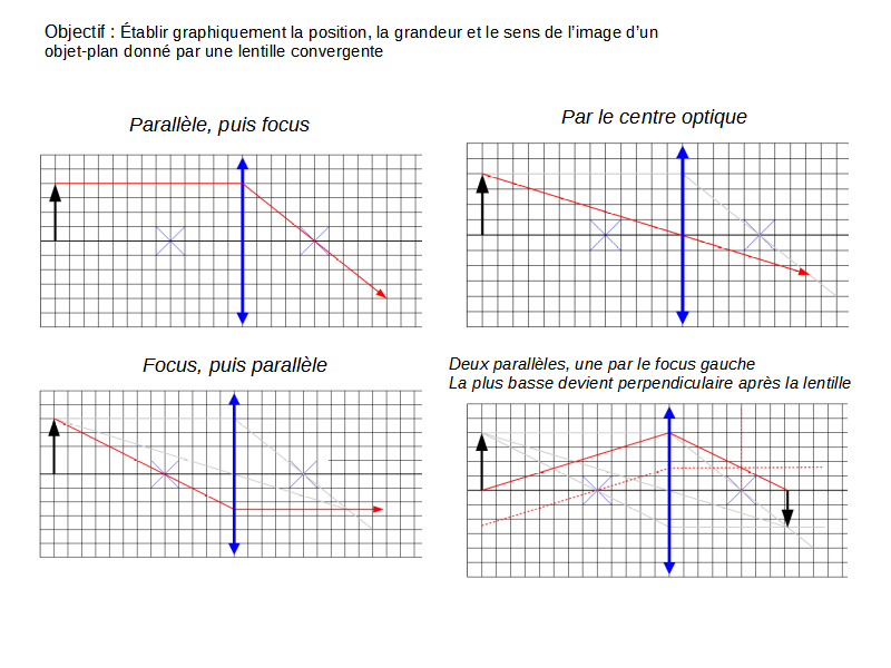 - (optionnel) un trait qui passe par le point focal gauche, puis parallèle à l’axe optique après la lentille