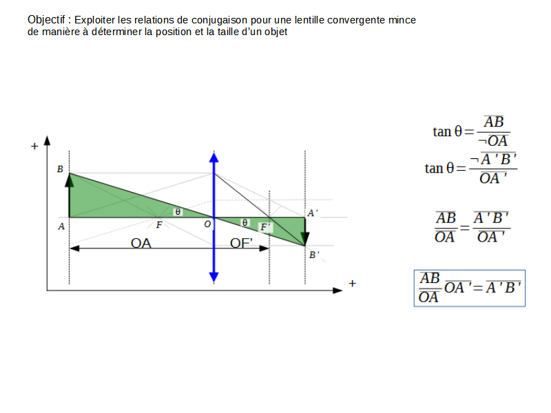 La dérivation de la relation de conjugaison de Descartes s’obtient par simple trigonométrie. Il faut par ailleurs noter que les segments ont un sens : négatif vers la gauche et vers le bas, positif vers la droite et vers le haut.