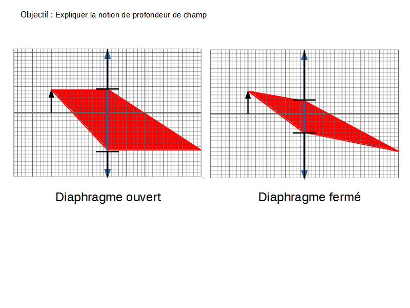 Le principe du diaphragme est analogue à celui de la petite ouverture dans une camera obscura. En réduisant le nombre de rayons, on réduits ceux qui n’arrivent pas au bon point et on augmente la netteté de l’image. Nous allons démontrer cela en utilisant les diagrammes à rayon.