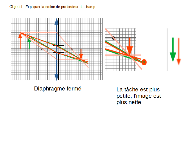 Si on ferme le diaphragme, certains rayons qui arrivaient sur l’écran au mauvais endroit (en dehors du point) sont supprimés. La tâche gaussienne est réduite, et l’image de l’objet orange apparaît plus nette.
