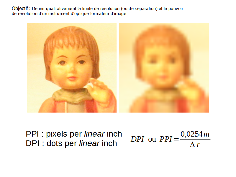 La résolution d’une image varie selon qu’on parle d’une image à l’écran (PPI) ou d’une image imprimée (DPI). Avec le pouvoir de résolution, on peut calculer la résolution minimal d’une image afin qu’elle apparaisse nette selon l’instrument d’observation.