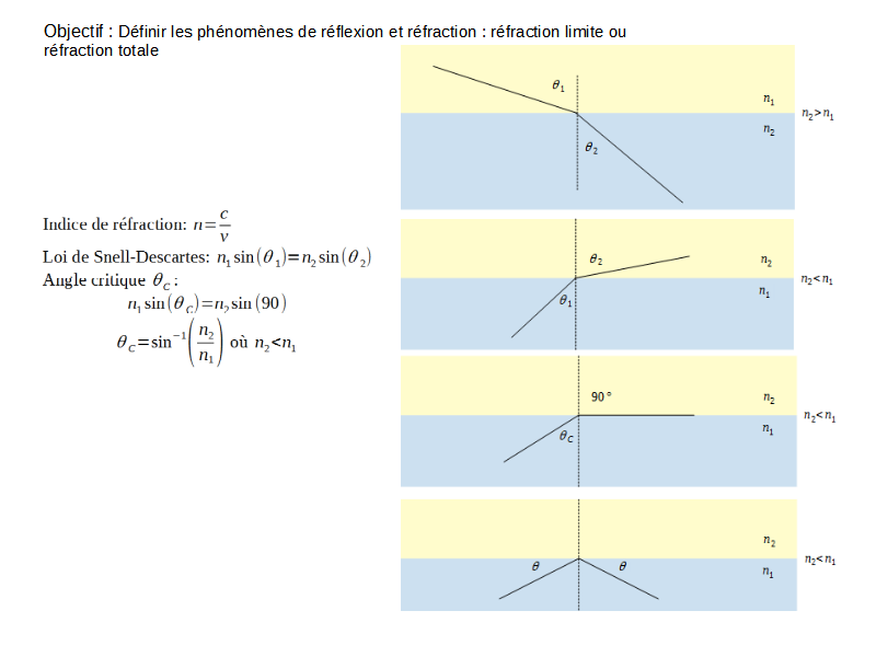 On sait que l’angle du rayon réfracté θ2 dépend des indices de réfraction et de l’angle du rayon incident. Si le rayon incident vient d’un médium à l’indice supérieur à celui dans lequel le rayon sort, un angle critique θC apparaît. A cet angle, la réfraction limite, où le rayon sortant rase la surface, l’angle sortant est égal à 90°.