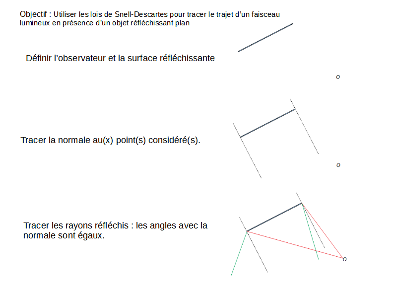 On sait qu’un rayon réfléchi à un angle avec la normale identique à celui que fait le rayon indicent. Dans le cas d’un objet réfléchissant plan, on peut trouver le champ de vision pour un observateur O. Il suffit de retracer le trajet de la lumière venant d’un objet jusqu’à l’observateur : tracer les rayons aux extrémités du miroir en direction de l’observateur, puis tracer, en appliquant la première loi de Snell-Descrates, les rayons incidents à ces extrémités. La zone entre les lignes vertes est un champ de vision.