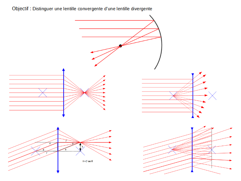 Les symboles usuels pour les lentilles convergentes et divergentes sont indiqués en bleu sur les schéma.